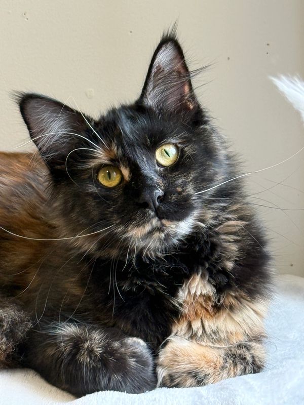 She is the daughter of Moonbeam Enticing and Noblesse Irresistible, and she has inherited the excellent temperaments of both parents. Genesis is affectionate, playful, and slightly mischievous, and she approaches interaction with ease and confidence. She is gentle and curious, and she consistently displays the engaging nature that makes the Maine Coon such an exceptional breed.